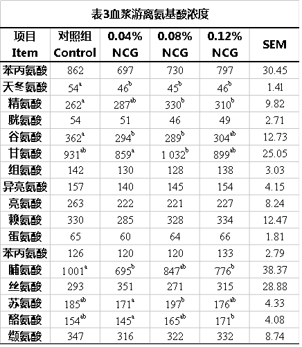 從本試驗(yàn)所檢測(cè)的血液生化指標(biāo)來(lái)看,各NCG組降低了BUN含量,說(shuō)明添加NCG提高了母豬利用飼料中的氨基酸的效率,與Mateo等的報(bào)道基本一致;而升高的鋅離子、磷離子含量有可能與精氨酸生成多胺促進(jìn)DNA和蛋白質(zhì)的合成有關(guān)。