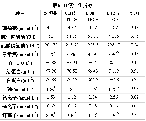 由表6可知,日糧中添加NCG對(duì)母豬血液生化指標(biāo)基本無(wú)影響。添加NCG各組都顯著降低了尿素氮 (BUN) 的濃度 (P<0.05),0.08% NCG組相對(duì)于對(duì)照組提高了磷和鋅的含量(P<0.05),同時(shí)0.12%NCG組相對(duì)于對(duì)照組有提高鋅含量的趨勢(shì)(0.05<P<0.1)。