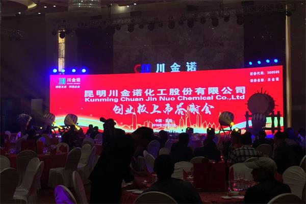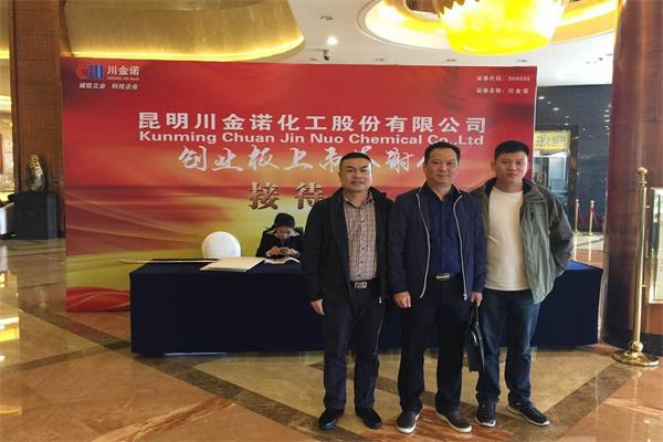 2016年10月31日晚,“昆明川金諾化工股份有限公司2016年上市答謝會暨MDCP新產品推薦會”在世紀金源大飯店一樓宴會廳隆重舉行,我司李宏斌總經理、何志強經理、姚勇經理參加會議。